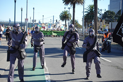 The march ended at Aquatic Park in San Francisco, where street performers including Lamentors, Xtractors, and a turquoise Rebel Brigade told a future story of distress in a world of rising seas and extreme weather, standing in the sand in front of San Francisco Bay.