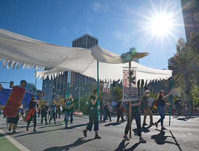 The march departed the Ferry Building and walked north for two miles on the Embarcadero. The group was packed with colors and costumes, featuring handmade puppets of fish and other aquatic species threatened by climate change. Flyers handed out along the way explained how COP is failing us.